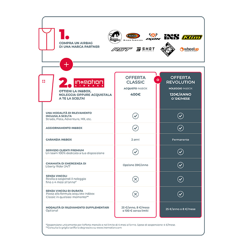 È necessario un abbonamento In&motion, con noleggio o acquisto dell'unità elettronica In&box. L'offerta In&Box Revolution a 120 € / anno o 12 € / mese corrisponde a un abbonamento senza impegno per il noleggio dell'unità, l'offerta In&Box Classic a 400 € corrisponde all'acquisto dell'unità. Unità elettronica In&box aggiornabile: aggiornamenti regolari.Il sistema di referral In&motion offre fino a 3 anni di abbonamento gratuito all'unità elettronica In&box.A seconda del Paese, i titolari di un abbonamento In&box (mensile o annuale) possono beneficiare della funzionalità "Chiamata d'emergenza" all'interno dell'applicazione mobile My In&box, grazie a una partnership tra In&motion e Liberty Rider (funzionalità disponibile per gli iscritti in Francia, Belgio e Italia con un numero di telefono francese, belga o italiano).
